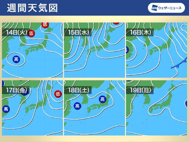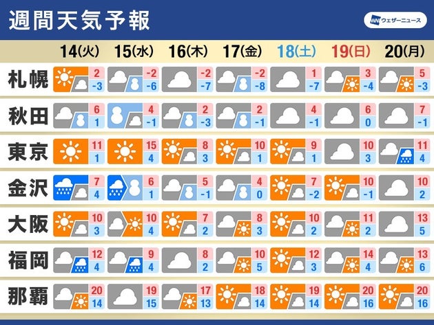 週中頃になると再び寒気の影響を受けて気温が下がり、15日(水)は西日本を中心に、16日(木)と17日(金)は全国的に真冬の寒さとなる見通しです。その後、週末にかけて再び寒気の影響は緩んでいきます。