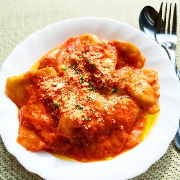 モッチモッチな水ギョーザはトマトジュースと煮るだけで生パスタに大変身します!作り方はとても簡単で、小鍋に材料を入れて5分煮るだけ!モチモチとした食感の水ギョーザがソースによく絡み、かむと肉汁が口の中に広がって最高にウマい!!難しい工程なく、調理工程も10分かからずあっという間にできるので、1人ランチや小腹が減った夜食にもピッタリですよ♪