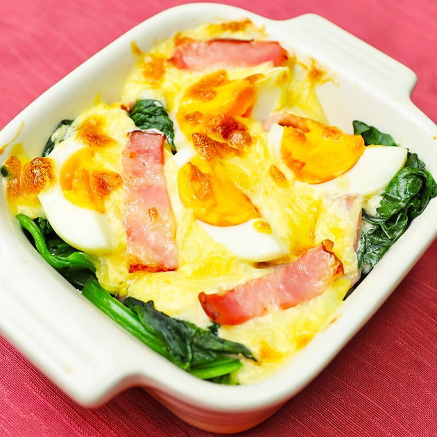 「ほうれん草」と卵とベーコンで簡単なレシピ!マヨネーズとチーズをのせて焼くだけで、コク旨なおかずができますよ。ゆで卵とベーコン入りで、ボリューム満点です!トースターで作れる「ほうれん草とゆで卵のマヨチーズ焼き」レシピ。旬のほうれん草を存分に味わってくださいね!