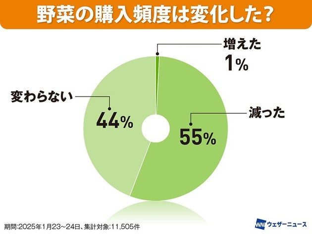 ウェザーニュースで「野菜の購入頻度は変化した?」というアンケート調査(期間=1月23~24日、集計対象=11,505件)を行ったところ、男性の51%、女性で62%が「減った」という結果となりました。