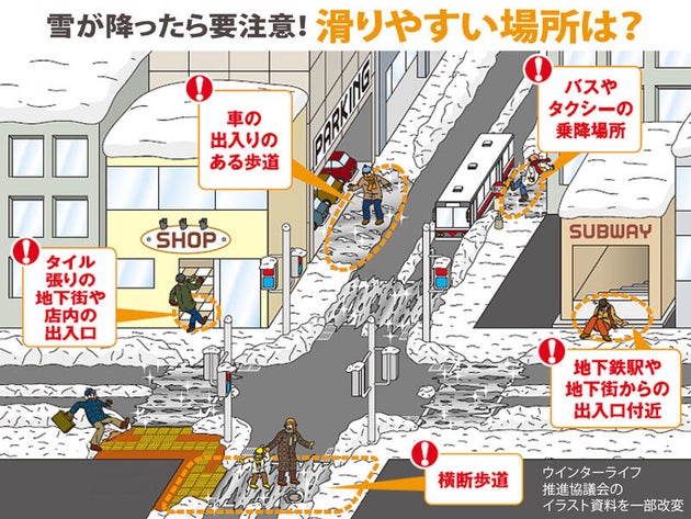 普段あまり雪が降らない都市部で突然の雪が降ると、転倒する人が続出します。街中で滑りやすい場所を知っておくだけでも転倒事故を防ぐのに役立ちます。