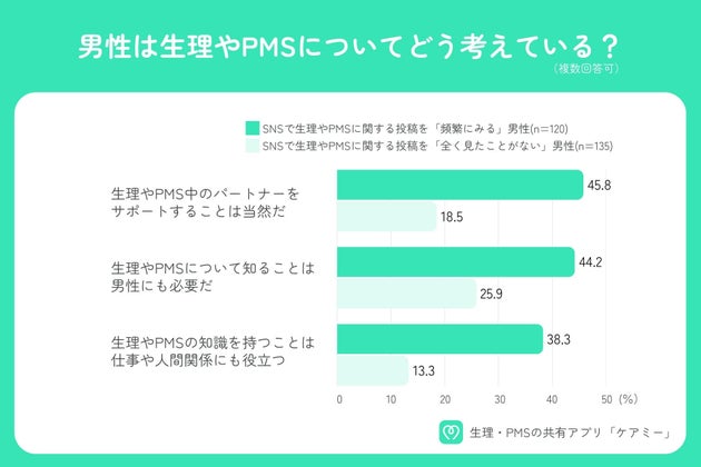 生理やPMSに関する投稿を「頻繁に見る」男性の45.8%が「パートナーをサポートするのは当然」と回答した一方で、全く見たことがない男性では18.5%にとどまりました。