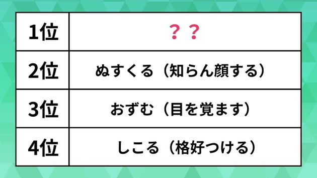 2位の「ぬすくる」は、熊本の方言で「知らん顔をする」や「すましている」という意味。博多弁などでは「なすりつける」を意味する言葉です。