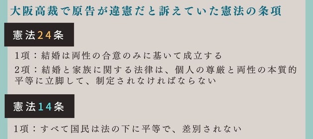 大阪高裁の本多久美子裁判長は判決で、同性カップルの結婚を認めていない現在の民法や戸籍法の規定は「性的指向による差別」で「同性カップルの個人の尊厳を著しく損なう」ものだと認定。憲法14条1項と24条2項違反だと判断した。