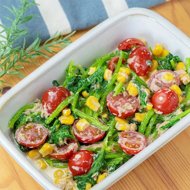 ほうれん草とミニトマトがあったら作るしかない!【ほうれん草とトマトのツナマヨコーン】のレシピを紹介します♪ゆでたほうれん草と材料を和えるだけで作れるから難しいことなし!ツナマヨ風味で大人も子どもも大好きな味に仕上げてみました。彩り豊かで食卓も映えますよ♪