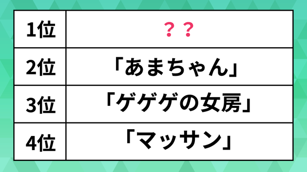 3位は「ゲゲゲの女房」。漫画家・水木しげるさんの妻である武良布枝さんのエッセイをもとにした作品です。「夫婦2人の会話が素敵でした」とのコメントが寄せられました。