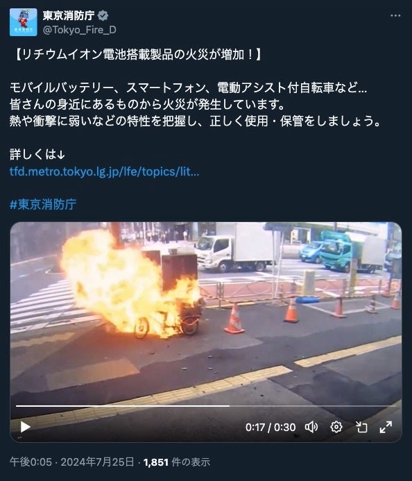 【あわせて読みたい】自転車から煙⇨突然爆発?東京消防庁が火災の瞬間を公開、リチウムイオン電池が原因