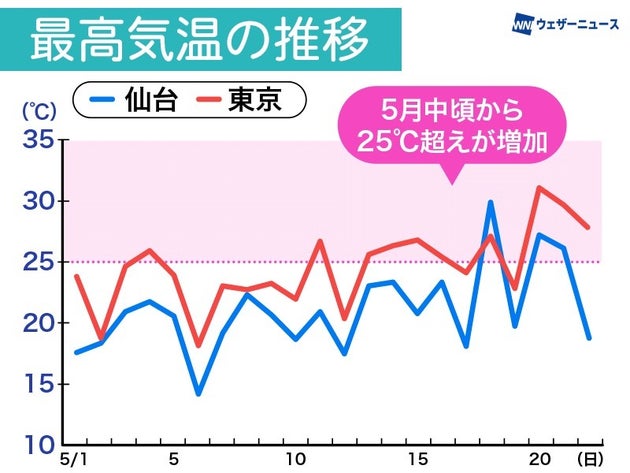 5月の最高気温をみると、西日本や東日本は5月中旬以降から25℃を超えることが多くなりました。