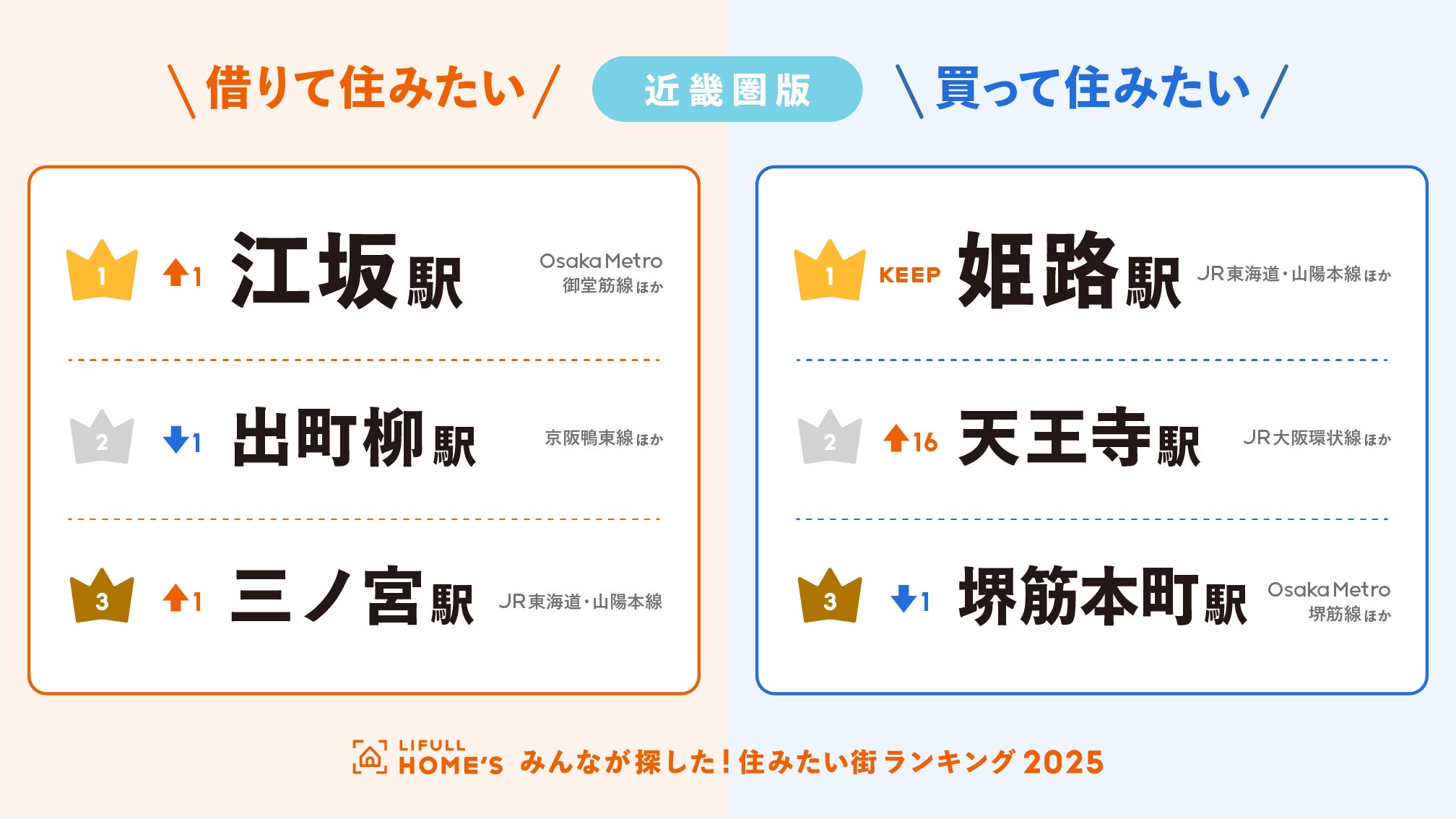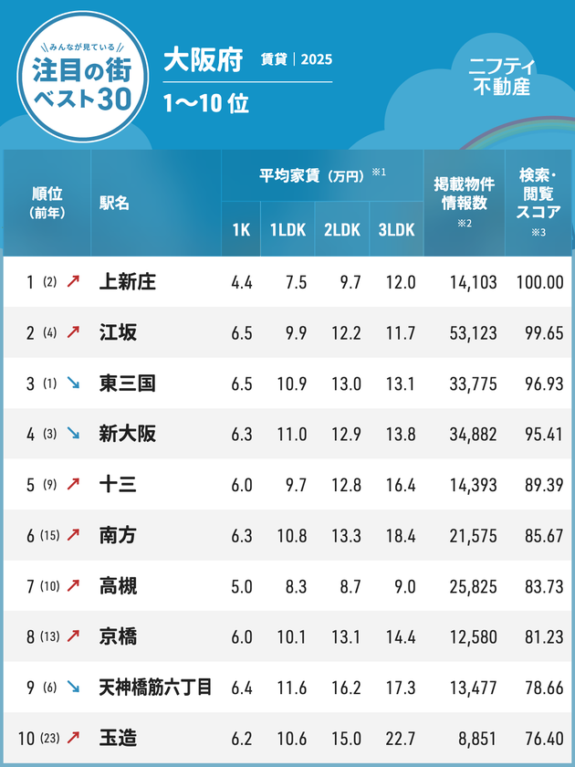 ランキング上位は、大阪都心部と郊外を結ぶOsaka Metro御堂筋線や、大阪と京都を結ぶ阪急電鉄京都本線沿いのエリアが目立った。通勤・通学の交通利便性と、家賃のバランスのよい街が注目を集める傾向にあるようだ。