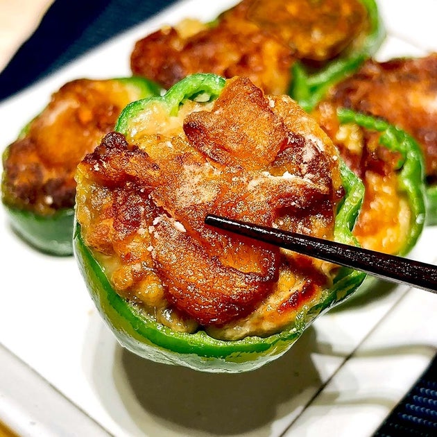 これ、唐揚げより好きかも!?輪切りピーマンに豚肉をギュッと詰めて、あとは焼くだけで外ザク中ジューシー!衣いらずなのに食べ応えバツグン。ご飯もお酒も止まらなくなる、罪なウマさです。