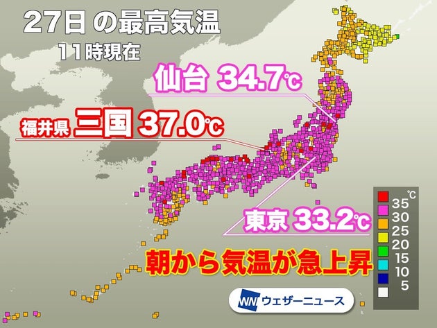 今日27日(日)11時までに、仙台34.7℃、東京33.2℃、大阪34.7℃、福岡34.2℃まで上がっています。11時までに最も気温が高くなったのは、福井県坂井市三国の37.0℃でした。