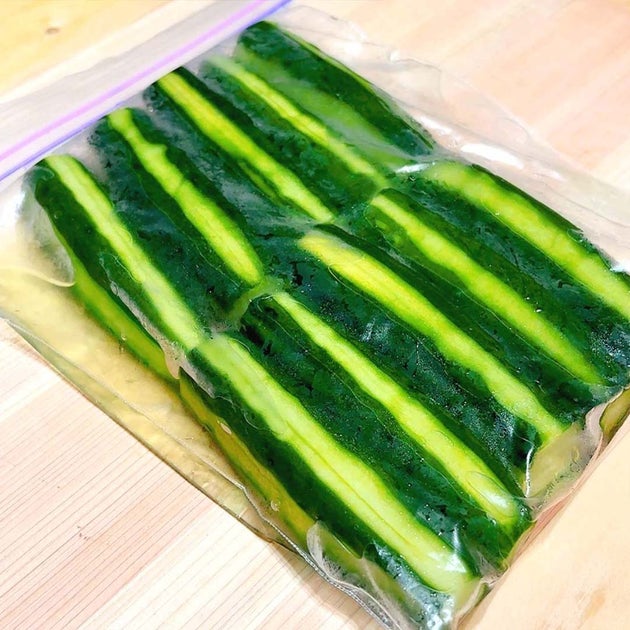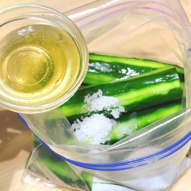 ② きゅうりの皮をあみ目にむき、半分に切る。保存袋にきゅうりと①、塩、酢を入れる。