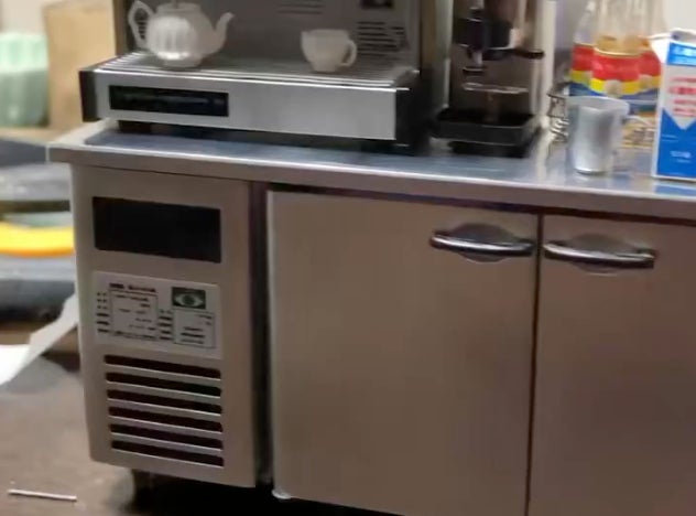 動画に映るのは、大きな業務用の冷蔵庫。上にはエスプレッソマシンやコーヒーミル、シロップが並び、まるでカフェの風景のようです。