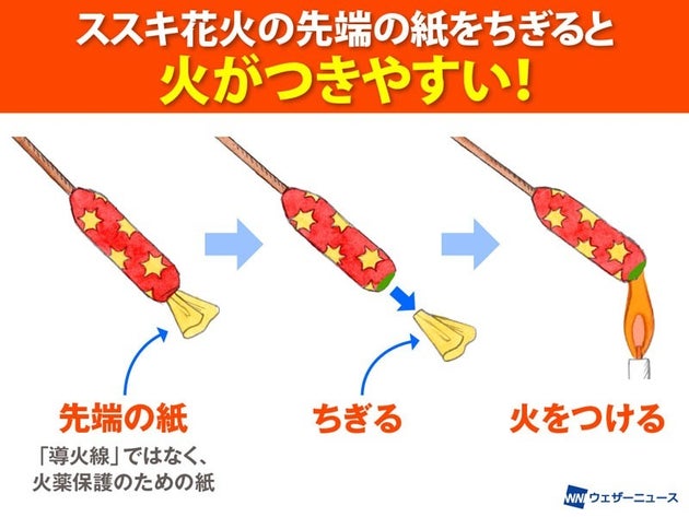 これからススキ花火を楽しむ機会があったら、先端部分の紙をちぎり取って、火をつけてみてください。すぐに火がついて、ススキ花火の特長であるカラフルな変色ぶりが楽しめます」(竹内さん)