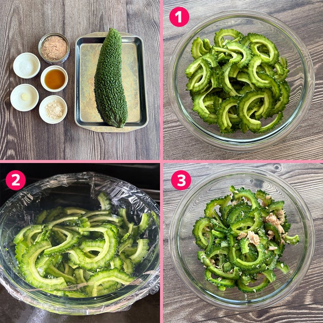 ① ゴーヤは縦半分に切り、種とワタを取り除いて薄切りにする 。耐熱ボウルに入れ、塩をふって10分ほど置く。