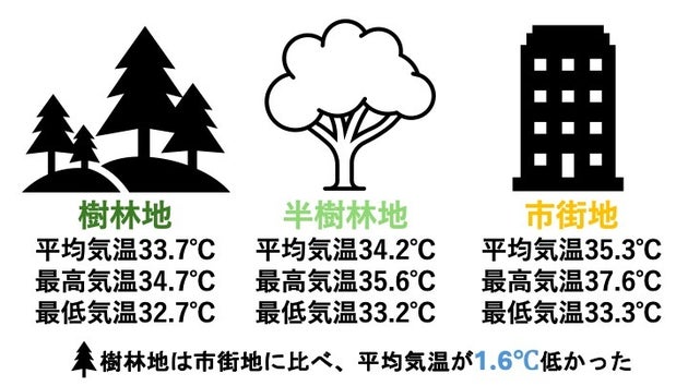 また最高気温も、市街地が37.6℃だった一方で樹林地は34.7℃と、2.9℃の差が生じていた。