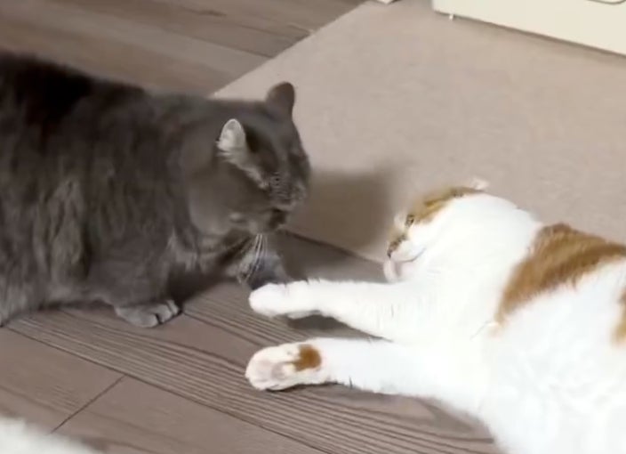 自ら仕掛けて、即返り討ちに… 愛猫2匹の力関係に「可愛すぎる」の声