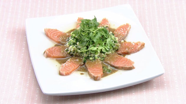 6.さけを7mm厚さに切って器に並べ、4、わさびソースをかけ、香菜をのせる。