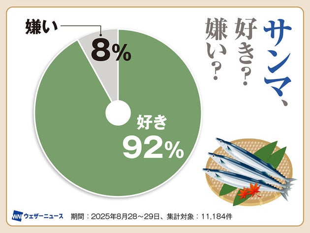 ウェザーニュースが実施した「サンマ、好き? 嫌い?」というアンケート調査を実施したところ、「好き」が92%と、老若男女を問わず圧倒的な支持を集めていることが分かりました。
