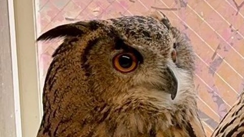 「究極のリラックススタイル 両翼だらーんのお座り ついつい構いたくなってしまい、辞めて!と怒られるスタッフ…. だってその手可愛すぎるでしょ〜」というコメントを添え、窓辺にいるユーラシアワシミミズクを公開しました。