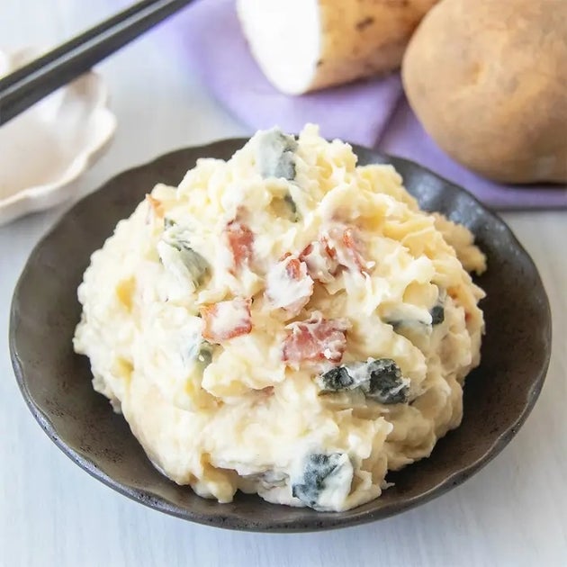 長芋をすりおろしてじゃがいもと混ぜてみて!滑らかで風味も良い史上最高のポテトサラダができちゃいます!もうこれはリピート確定間違いなし♡しょうゆやごま油、カリカリに焼いたベーコンを入れることで濃厚でクセになる味になります!ベーコンの代わりにソーセージ、焼きのりの代わりに韓国のりを入れてもおいしいですよ♪