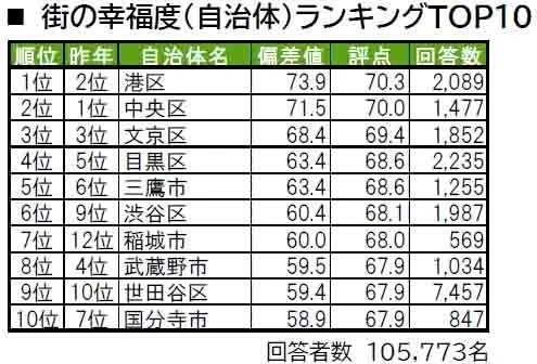 中央区・港区・文京区・目黒区は、「住み続けたい街ランキング」「街の幸福度ランキング」の双方でトップ5に入っており、高い人気がうかがえる。