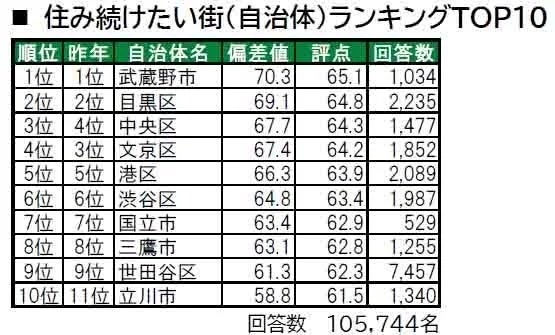 1位は、2年連続で唯一偏差値70台の評価を得ている武蔵野市。「街に愛着がある」「住みたい街」など複数のランキングで上位に入るなど、高い評価を得ているという。2位も昨年に続いて目黒区。上位5位は、多少の順位変動があったものの、ランクインした街は2023年と同じ結果になった(武蔵野市・目黒区・中央区・文京区・港区)。