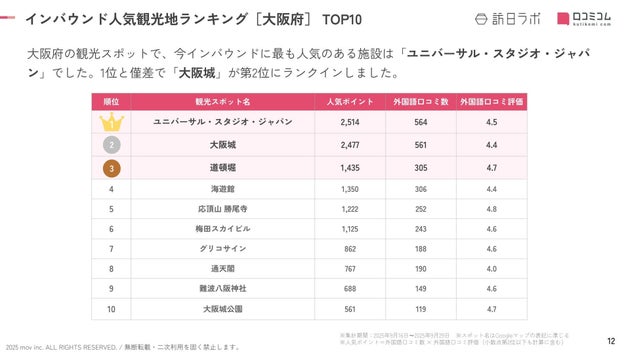 インバウンド事業に関するメディア「訪日ラボ」や集客サービスの運営を行うmovが、10月8日に「外国人観光客に人気のある大阪の観光地」ランキングを発表。