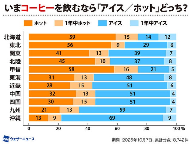 ウェザーニュースでは、10月7日にスマートフォンアプリ利用者へ向けてコーヒーに関するアンケート調査を実施したところ、アイスからホットへ切り替えている地域が見られました。