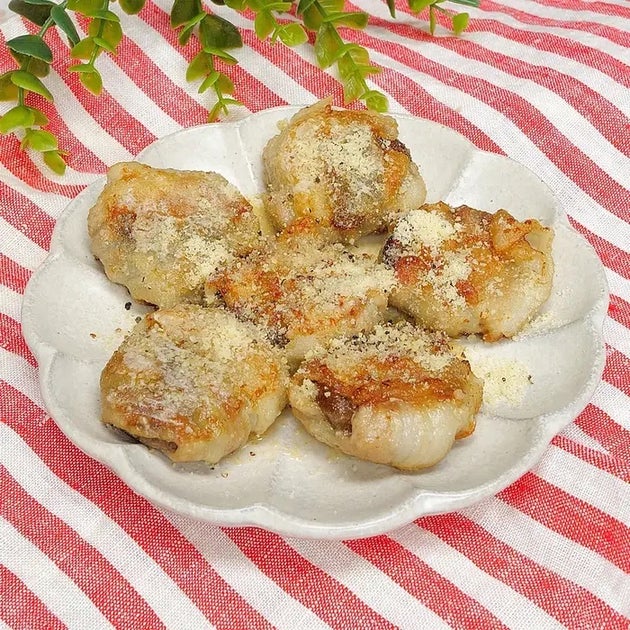 ジューシーなしいたけを豚バラ肉で巻いてこんがり焼いた「しいたけの肉巻きパルメザンがけ」♡ 香ばしいパルメザンチーズをふりかければ、お店のような一品が完成!にんにくバターの風味が食欲をそそり、クセになること間違いなしです。おかずはもちろん、おつまみとしてもぴったり!
