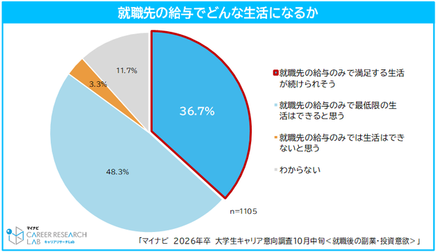 就職先の収入で「満足のいく生活ができる」と考える学生は3人に1人。マイナビが2026卒の副業・投資意欲を調査