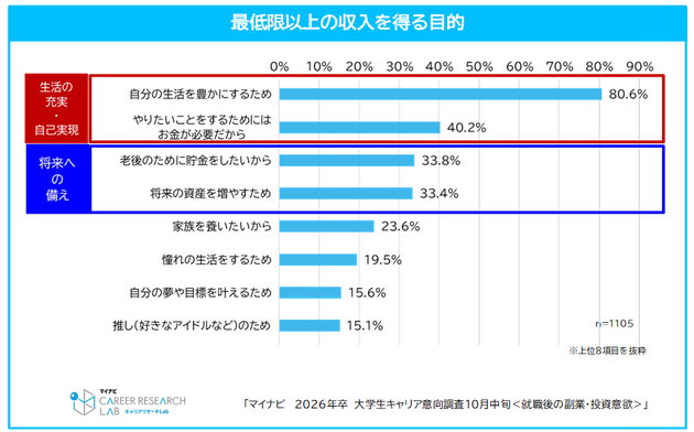 さらに、「最低限以上の収入を得る目的」について聞いたところ、最も多かった回答は「自分の生活を豊かにするため(80.6%)」であり、次いで「やりたいことをするためにはお金が必要だから(40.2%)」といった、生活の充実や自己実現を目的とした回答が上位にあがった。さらに、「老後のために貯金をしたいから(33.8%)」、「将来の資産を増やすため(33.4%)」など、将来設計を意識した堅実な回答も多く見られた。