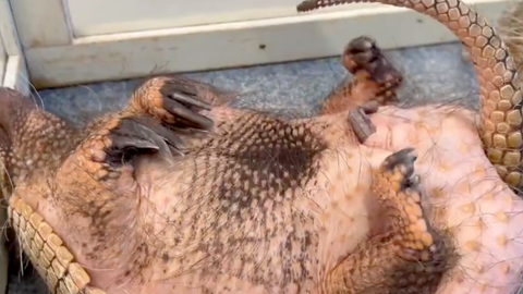 映っているのは、アルマジロのジローラモ君。草津熱帯圏の担当者によると、妻のむっちゃんには頭が上がらないという優しい性格の持ち主なのだそう。ジローラモ君は、いつもはヒーターのある暖かい寝室で眠るところを、この日はなぜか外に出て仰向けで寝ていたとのこと。