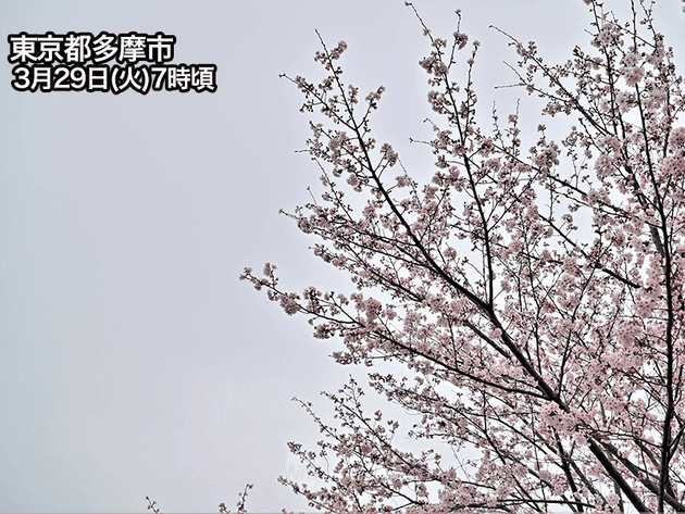 最高気温は東京都心や千葉市、横浜市で13℃予想。ほとんどの所で気温が昨日よりも5℃前後低く、1日で1か月あまり季節が戻ったような体感となります。連日各地で桜が満開となり見頃を迎えていますが、今日は花冷えとなりそうです。