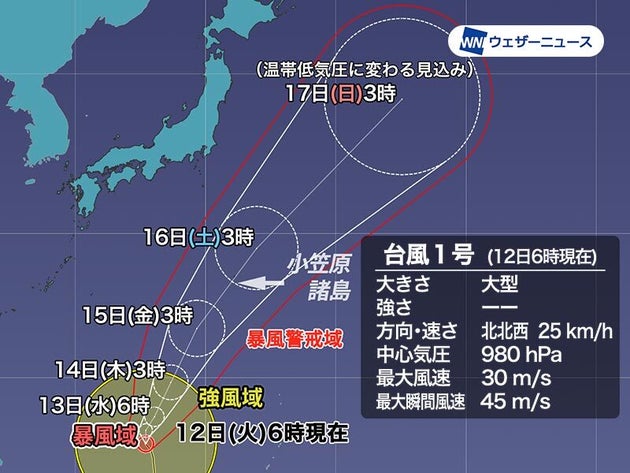 台風1号、15日頃に小笠原へ接近のおそれ。大雨や暴風に警戒