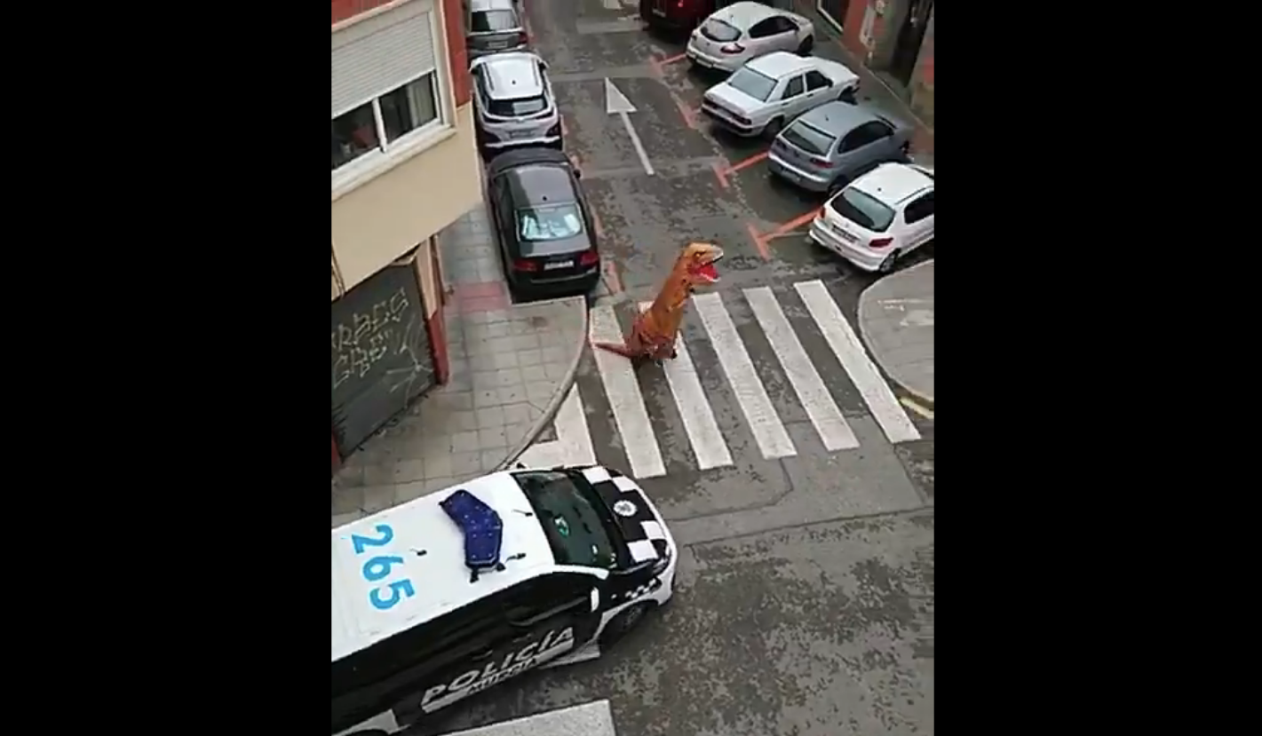 動画には、人間サイズのティラノサルウスの着ぐるみが、愛犬とたわむれる様子が写っている。