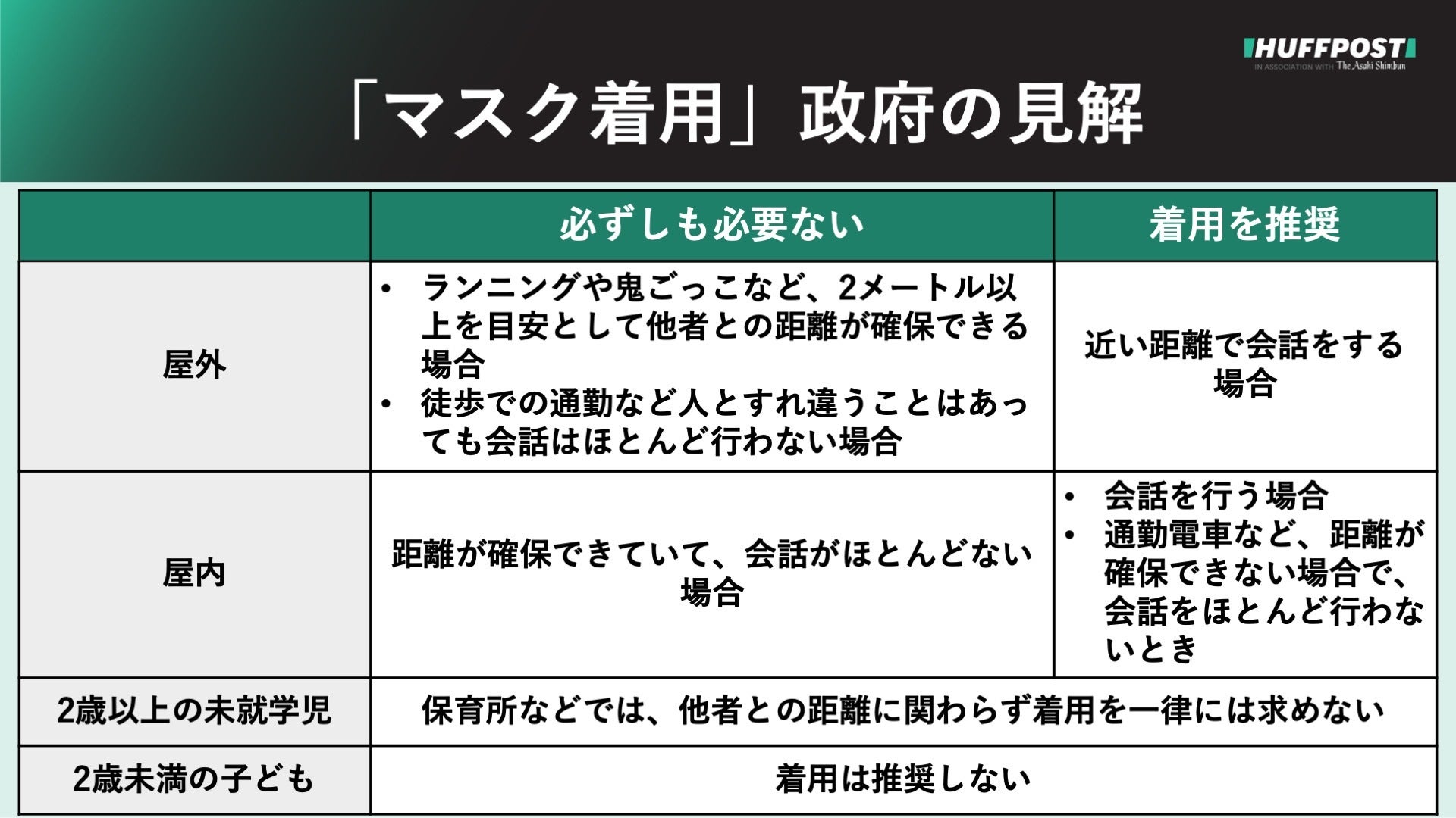 政府は20日、マスクの着用について政府の見解を発表。屋外でのマスク着用が必ずしも必要でない場合や、子どものマスク着用をめぐる政府としての見解を示していた。