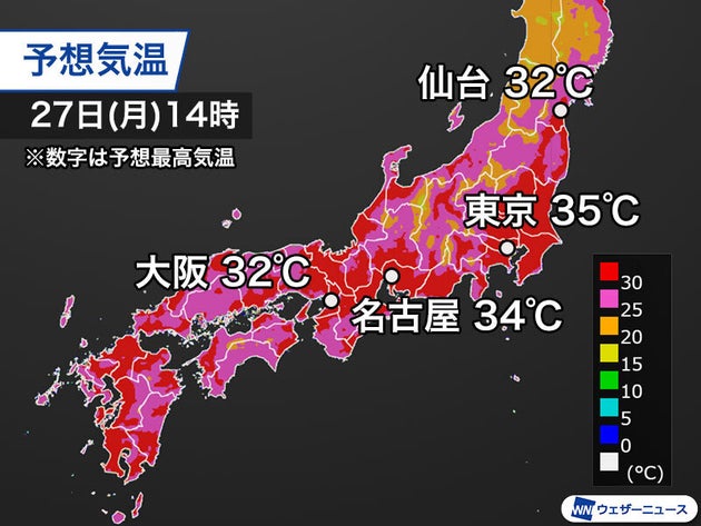 東京は3日連続で猛暑日の予想 。熱中症に警戒を【27日の天気】