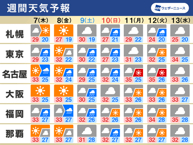 今年は統計史上最も早く梅雨が明けたところもありますが、各地で梅雨が戻ったような天気が続く見込みです。