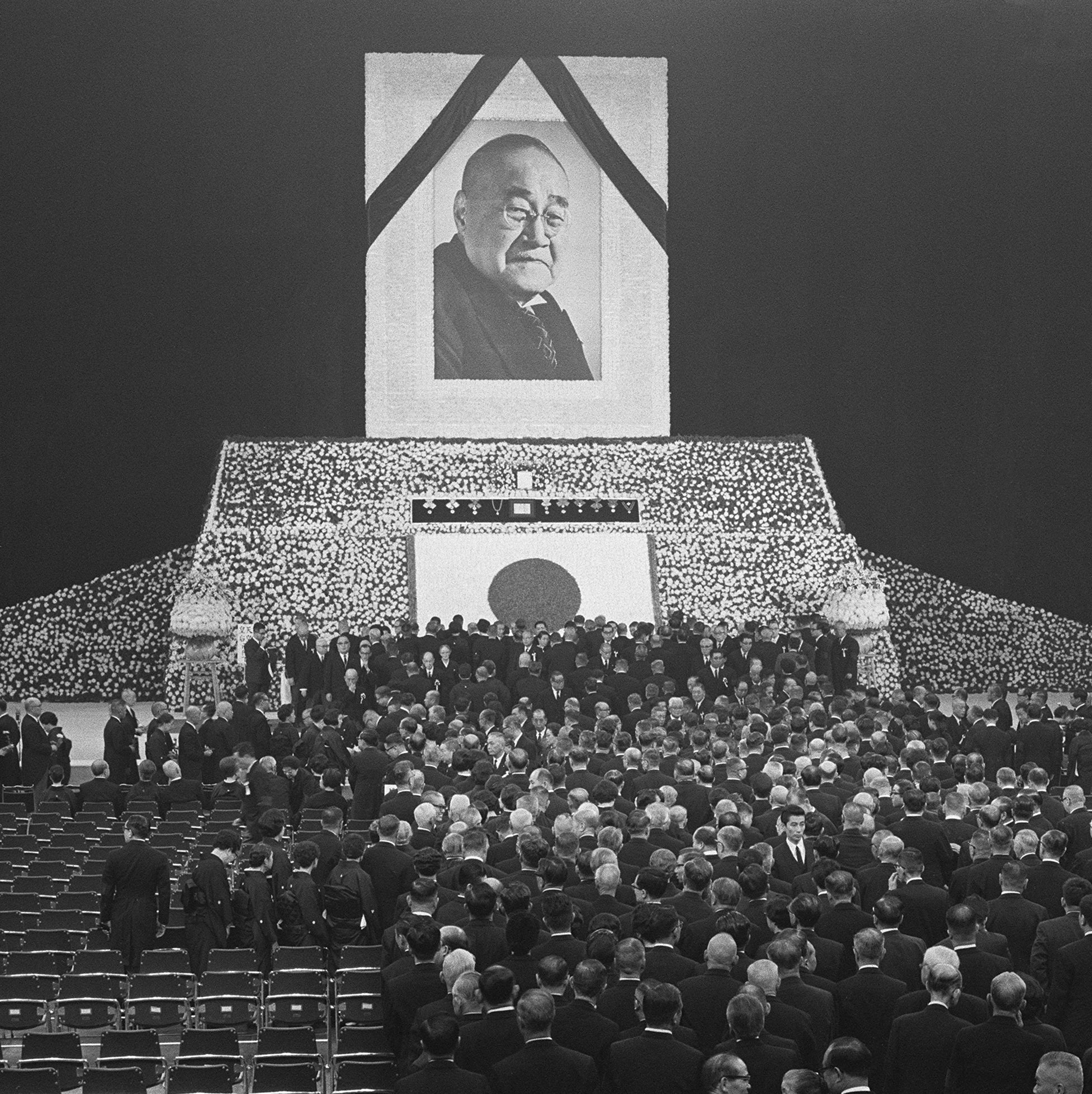 吉田茂氏の国葬で、献花する参列者(東京・千代田区の日本武道館)=1967年撮影皇族方や外国特使らが参列、弔砲の発射も