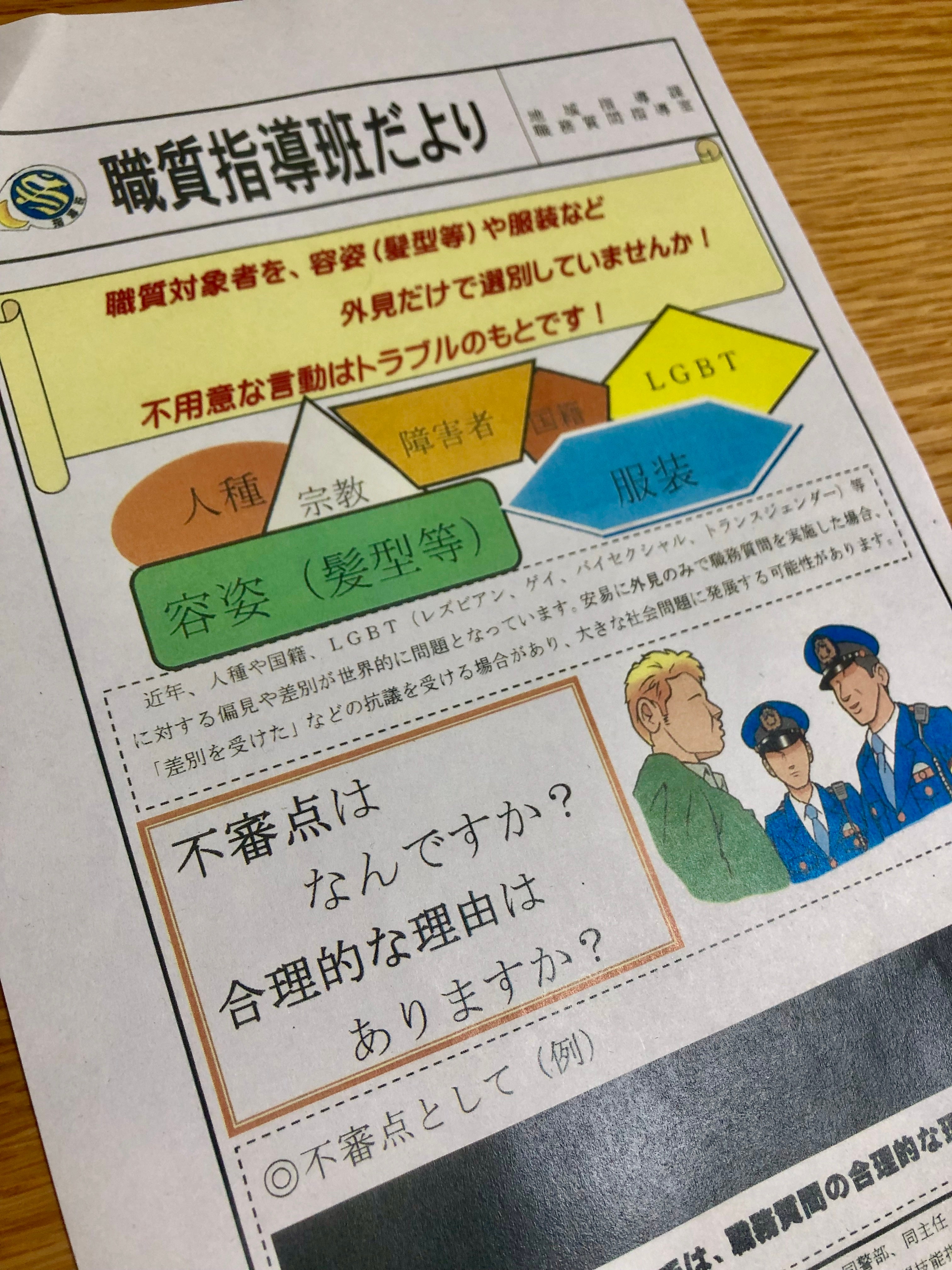 中尾に対し、「外国人は犯罪の割合がデータ上高いので、どうしても見た目でふるいをかけて、日本人じゃない人から取り締まらないといけない」と言う警察官もいた。